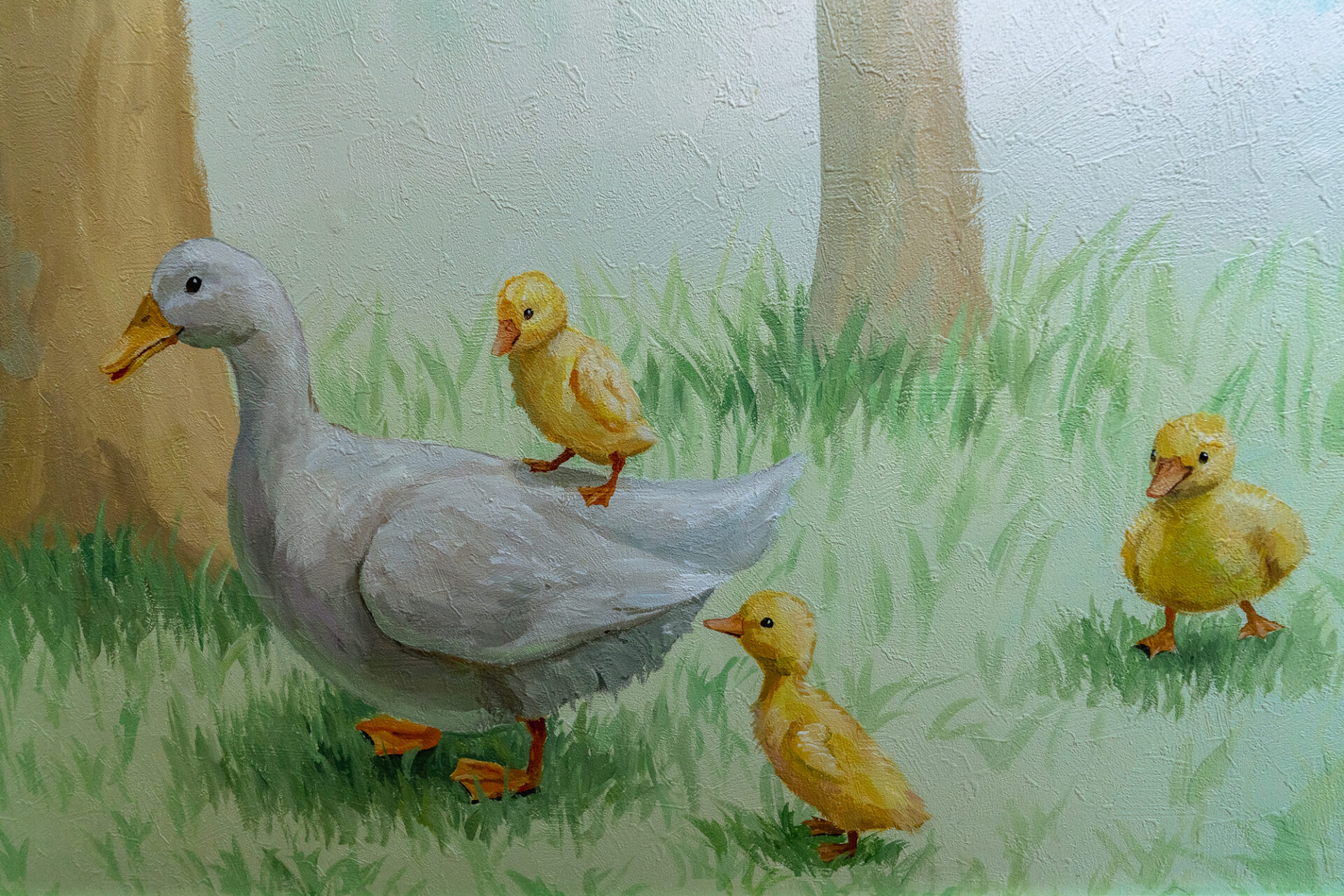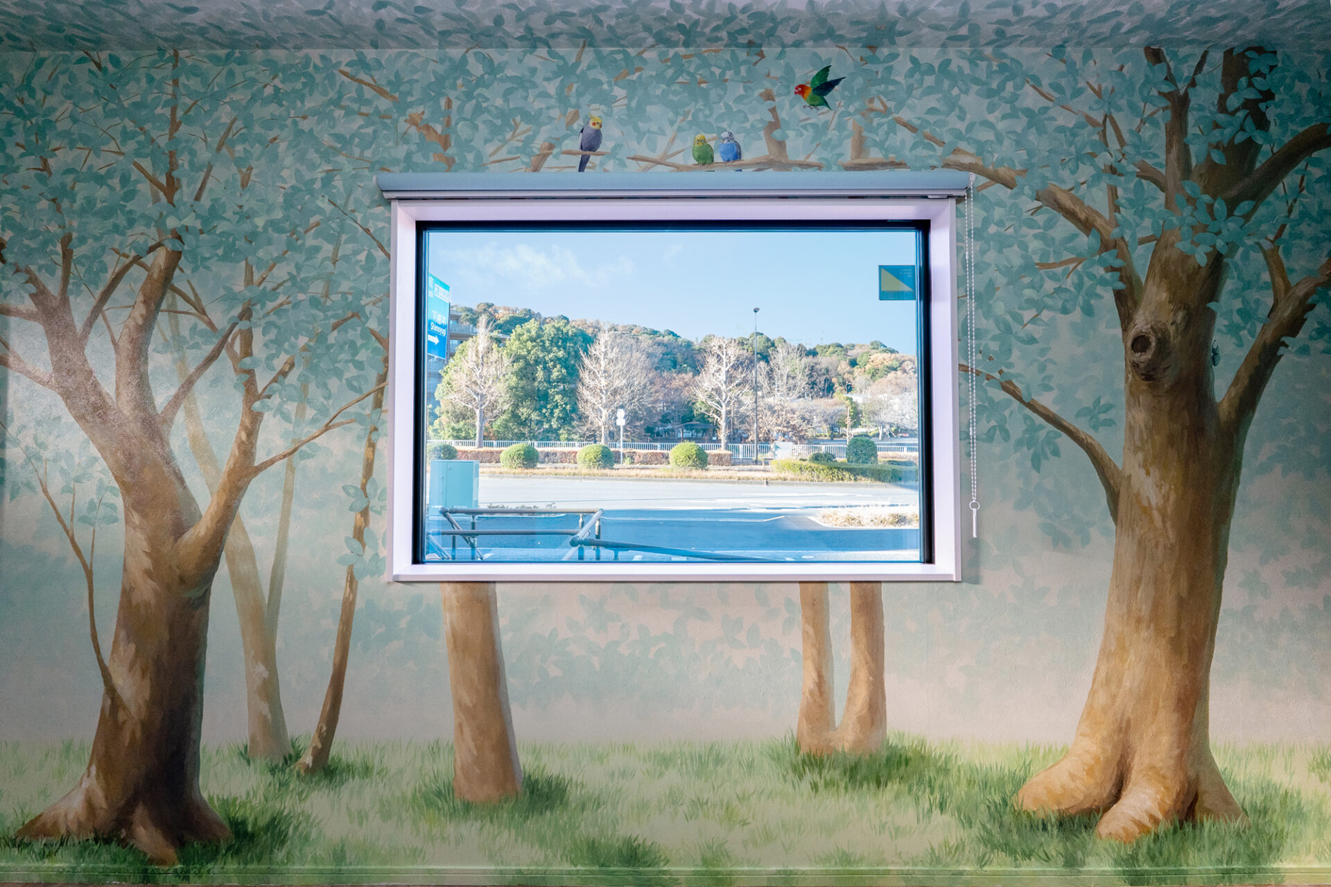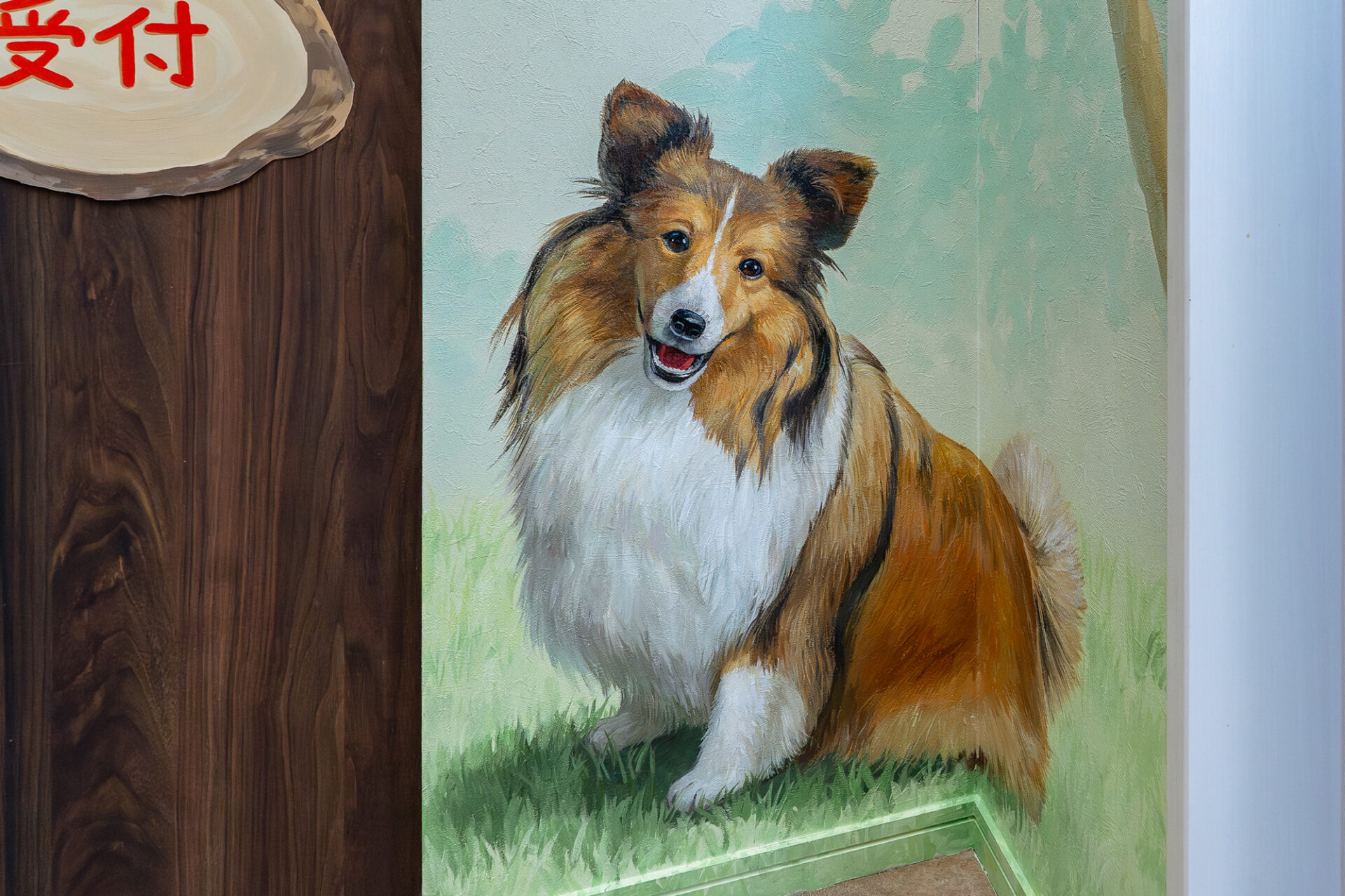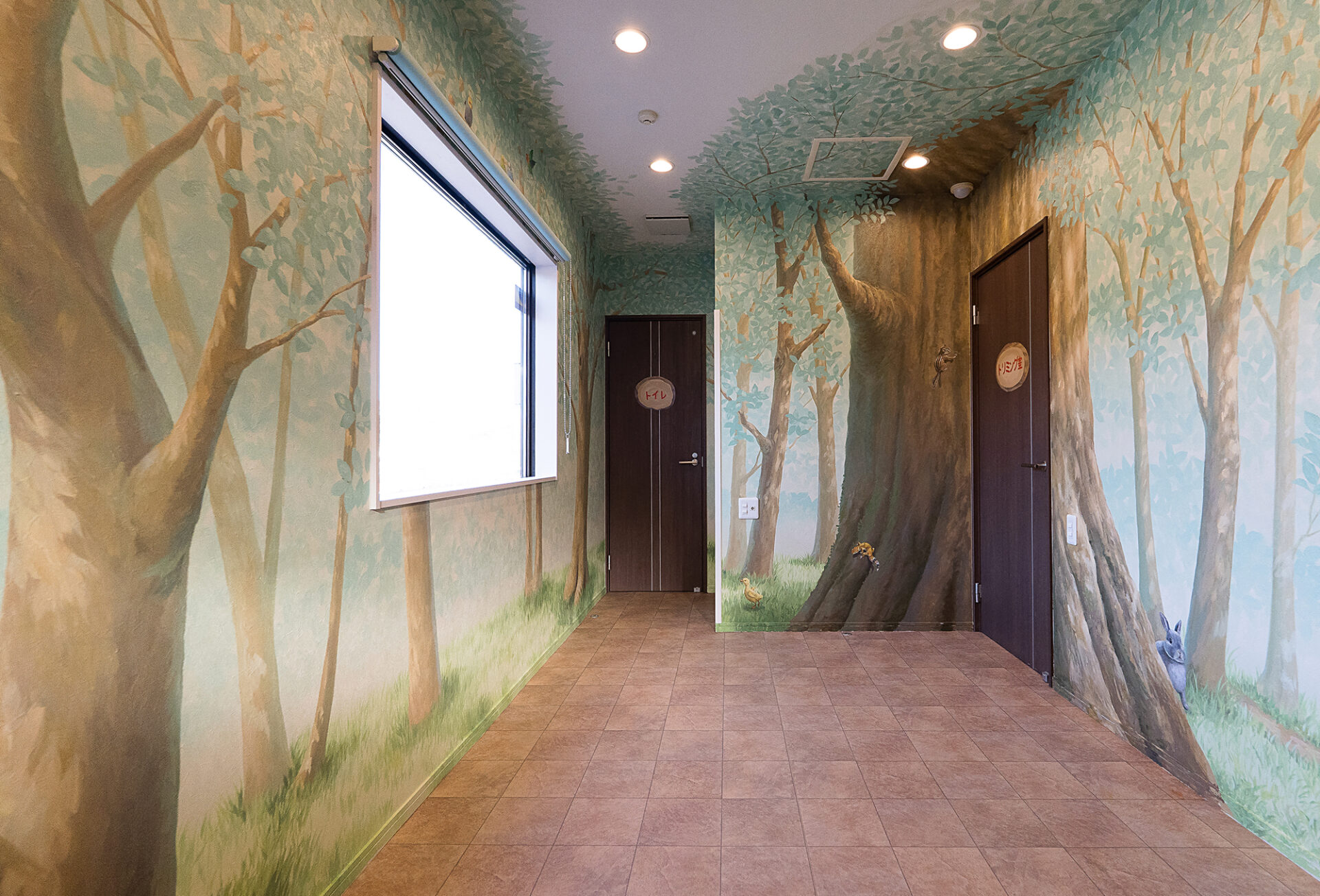 診察前で緊張しがちなわんちゃんや猫ちゃんが、少しでもリラックスできるよう、淡いトーンを基調に木漏れ日が差し込む静かな森を表現しています。描き込みすぎて圧迫感が出ないよう、壁紙のベースカラーを活かしながら構成しました。